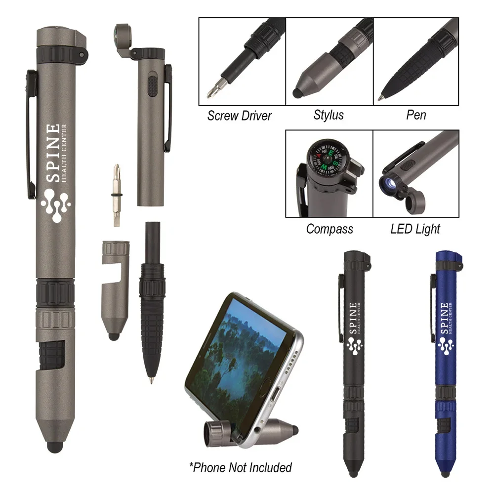 - Multi-function pen is six tools in one! Features a pen, stylus, phone stand, light, screwdriver, and compass